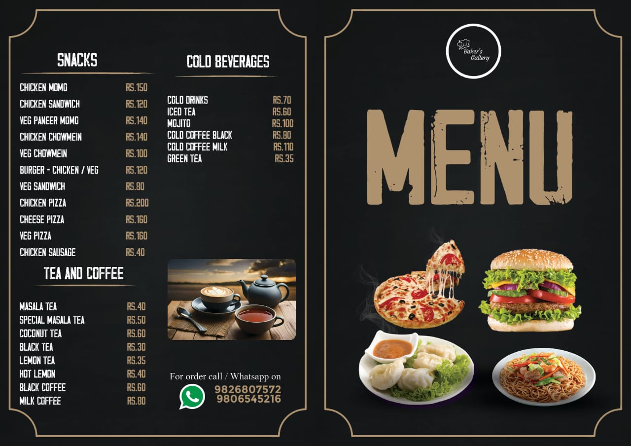 Bakers Gallery is a delightful cafe known for its variety of delicious offerings. Specializing in mouthwatering burgers, flavorful momos, savory chow mein, and freshly baked pizzas, it caters to every craving. Whether you're looking for a quick snack or a satisfying meal, Bakers Gallery serves up a menu that's sure to please, with delivery services available to bring your favorite dishes right to your door!